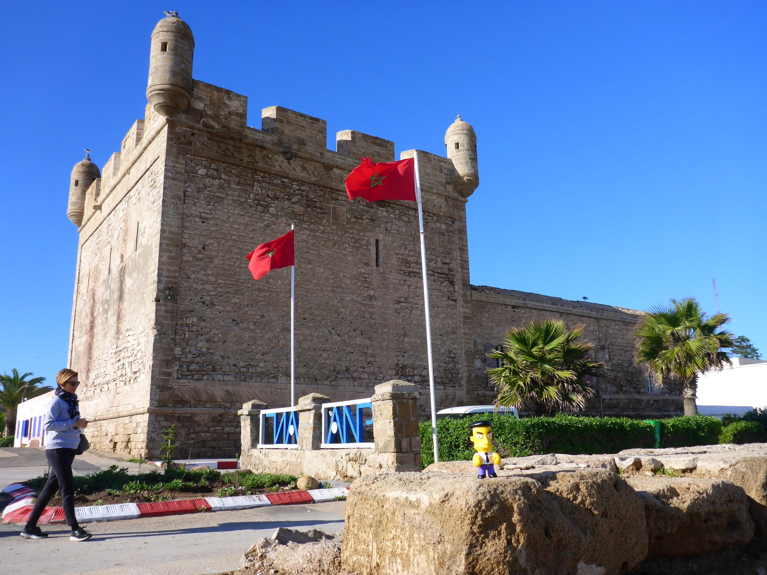 As I need to return to Essaouira I kept walking this time on the road for a change as I thought to get some sight seen of the mountains and hoped for a bus or lift since I had four hours to sunset. Three of four cars passed when Fiat stopped with couple from Germany in it. THNAK YOU guys ! We had a brief chat about where we have been, where are we going when I just fixed my belt as I saw police check in front of us and as expected we were pulled over. This time it was for speeding as we were doing 94 km/h instead of 80 km/h and the police was saying that it will be 150 dirhams. Since I was told by surfing lady that the cash should not be paid to policeman I told the drive r do not pay anything on the body camera. Well it was as expected, the policeman said 150 dirhams and turned his back with hand behind his back so it could not be captured on camera. As we said in the car, this is sponsoring of his family and maybe easier than being charged and have to go to police station or court and in the end it is only €15. Experience Morocco ! Well we drove slowly now but for me still faster than walking on my own back to Essaouira as it is about 40km. Couple have not been here and had no maps so they were happy to use my maps.me to navigate them to the hostel and I have increased the users of maps.me by four now 😊 Since I was back in the town earlier than I thought I went for stroll through other part of side street of Medina this time left hand side close to ocean and synagogue and this time it was nice and I came on the Scala fort what was nice part and view too.