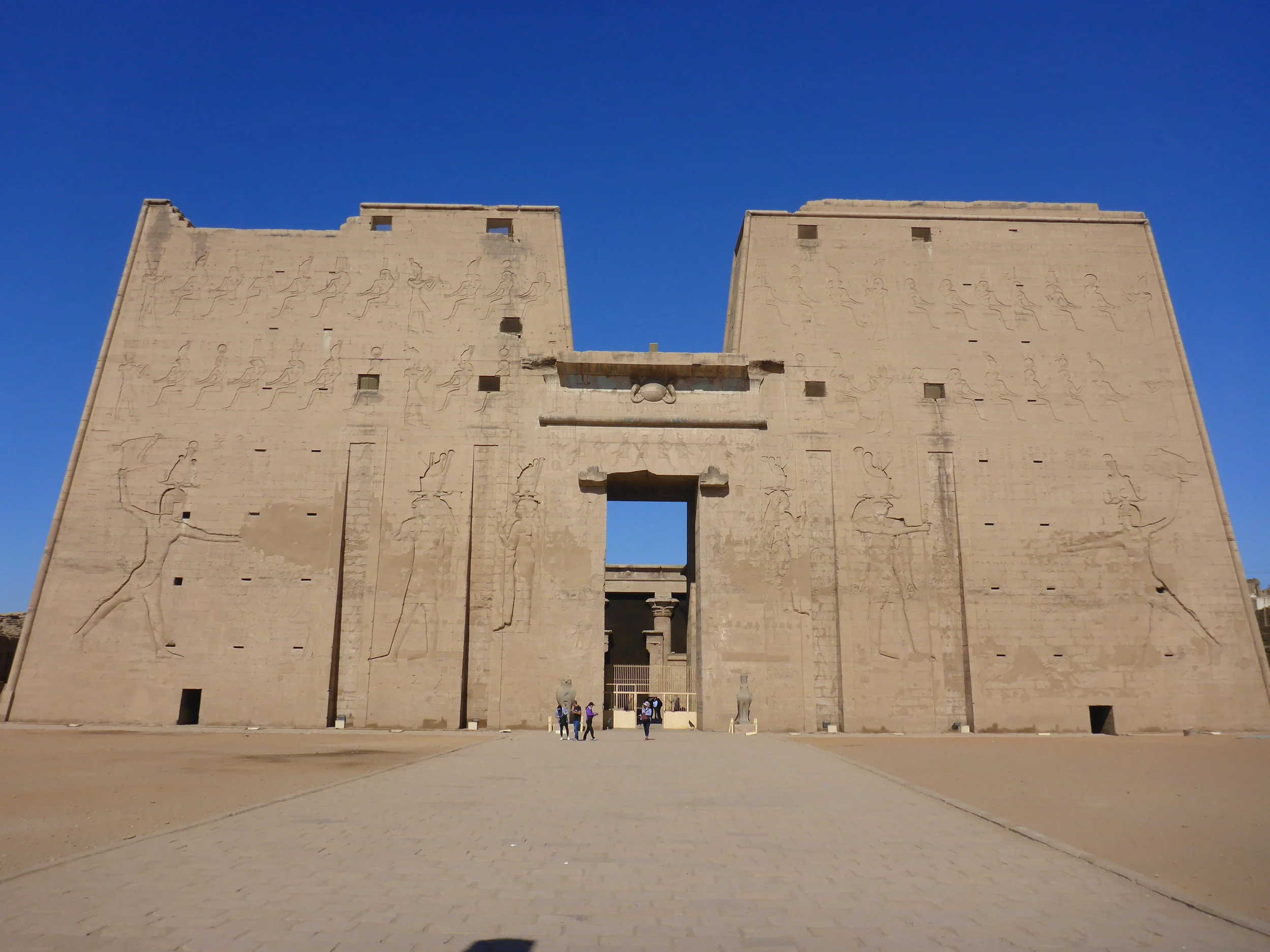 Since I had learned the lesson regarding the food on trip to Dendera I was not going to risk it here and stopped at local bakery for lovely round bread / cake what was something like puff pastry with a bit sweet taste and after another 10 meters I saw a fresh falafel being made and sold with fries from Aubergine so could not resist and got myself a nice bag of six falafel balls, two handfuls of aubergine chips and some hot peppers, what locals tried to gesticulate to me that no no, too hot and I gesticulated back yes yes just keep filling the bag 😊 Have to say one of the best street food in Egypt I had so far. Walking and eating in 5 min I was at the site and kept going around the fence until there was a gate. Simple deduction, soldier with AK47 and few guys in civil clothes but with 9mm in back pocket is good sign that you have reached the touristic site 😊 As usual all the sites are surrounded by shops what are along the entrance / exit and have small fence all along so if you do not want to jump over it you need to walk all the length of patch to get in and out. For 140 pounds I was in and start walking towards the temple what was towering above the walls of mud what surrounding it. It is really impressive temple and the gate itself is about 9 stories high and whole temple is in the great condition. I would say that it was the best condition I saw, all walls intact expect a small part of the left side of the gate at very top, where the last line of stone blocks were missing. Inner and outer walls beautifully carved with hieroglyphs and statues as well as rest of the temple.
